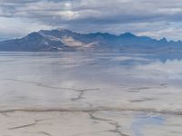 Vast open space in Salt Lake City, Utah, showcasing the scenic desert landscape with mountains in the background. The sun is visible, casting a bright shine on the salt-covered ground.