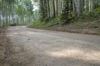 A car drives on a road in a forest area in Colorado. Trees surround the road, creating a scenic landscape. The green hillside adds to the beauty of the drive.
