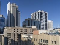 This is an image of a modern high-rise building in downtown Los Angeles, California. The clear sky contrasts with the sleek architecture of the building, showcasing the urban design of the city. The building is surrounded by other office buildings and condominiums. The image captures the bustling atmosphere of the business district, with people and cars visible in the parkings decks and garages below. The cityscape and skyline are visible in the background, emphasizing the urban setting. This photo represents the vibrant and dynamic nature of Los Angeles.