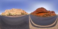 A panoramic view of a road in the Colorado desert, surrounded by majestic mountains. The straight road leads to a mountain pass, while the asphalt reflects the high desert sun. An elevated highway in a breathtaking natural environment.