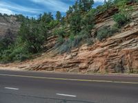 A scenic road in Zion National Park, Utah. Surrounded by majestic mountains and beautiful landscapes, this road offers a breathtaking view of nature. Clouds dot the clear blue sky, creating a picture-perfect day in the USA.