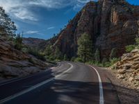 A road in Zion National Park, Utah, cutting through the landscape with hard shadows cast by the mountains. Clear skies and fluffy clouds add to the natural beauty of the scene.
