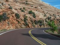 Asphalt road winding through the breathtaking landscape of Zion National Park in Utah, USA. Clear day with majestic mountains and clouds. Nature at its finest on this 1/4 section of the road.