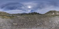 a photo taken from a virtualized picture shows the mountain landscape and sky with a full moon in the distance