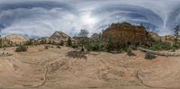 the image shows a panorama view looking up at a person walking in the mountains of zion