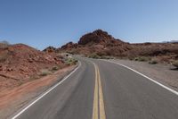 This is an image of a road in Nevada, USA. The road, made of asphalt, winds through the desert landscape surrounded by mountains. The clear sky above contrasts with the red rocks and rocky terrain below. This photo captures the natural beauty and geology of the southwest. It represents a typical day in Nevada's badlands, showcasing the unique rock formations and scenic views. The road is a vital piece of infrastructure, providing a thoroughfare for travelers to explore this stunning region.
