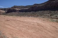This image captures the rugged beauty of the Utah desert in the USA. The vast landscape features red rock formations and mountains in the distance, contrasting with the brown terrain and vegetation. A dirt road cuts through the desert, surrounded by grass and rocky outcrops. The clear blue sky above adds to the sense of vastness and openness. This photo portrays the unique off-road track and natural beauty of the Canyonlands region in Utah.