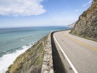 An elevated view of the Pacific Coast Highway in Big Sur, California. The road curves along the coastal cliffs, with the high mountains on one side and the vast ocean on the other. Nature's beauty is showcased in this picturesque coastal landscape.
