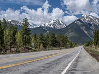 road in the mountains with pine trees and mountains in the background with blue sky with fluffy clouds