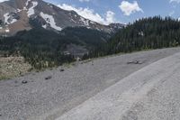 This image captures the natural beauty of Colorado, USA. The rugged landscape features mountains, forests, and cliffs, creating a picturesque wilderness. A dirt road winds through the scene, adding a sense of adventure and exploration. The clear sky with fluffy clouds provides a stunning backdrop for the towering mountain range. In the foreground, the gravel surface highlights the texture of the surroundings. The Moraine and Telluride can be seen in the distance, adding to the charm of this natural environment. This photo is a perfect representation of the breathtaking scenery that Colorado has to offer.