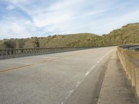 A scenic view of a concrete bridge on a highway in California during dawn. The road leads through a beautiful landscape with hills and a river. The yellow lines and guard rails add to the aesthetic of the road trip experience.