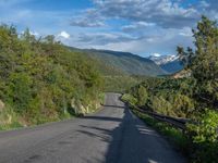 the road winds up on the mountainside on a sunny day with beautiful clouds and trees