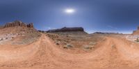 A rugged dirt road cutting through the desert landscape of Canyonlands, Utah. Red rock formations and towering cliffs create a stunning backdrop under a clear sky. An off-road adventure through the natural wonders of the USA.