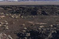 A rugged and elevated desert landscape in California, USA. The clear sky highlights the high mountain peaks and open space. Off-road tracks wind through the rocky and gravel-covered terrain, revealing the geology of the area. A fascinating mix of rock formations and volcanic features, including a majestic crater.