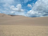 the man is riding his horse through the large expanse of sand dunes with blue sky and clouds over them