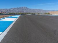 A race track in the USA on a sunny day. The asphalt road stretches straight ahead, with a curve in the distance. The clouds provide a picturesque backdrop for the thrilling race happening on the track.