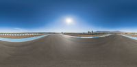 the camera pano lens captures a view of a racetrack and a desert setting with a fence in front