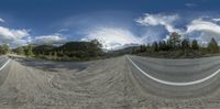 a 360 - degree image shows the mountain and road from a street corner, showing the winding curve