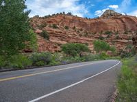 A scenic view of an asphalt road stretching through the Utah landscape. Clear skies and fluffy clouds create a beautiful backdrop for this picturesque road trip in the USA.