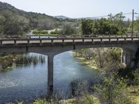 A scenic view of a rural road in California, with hills and trees in the background. The road curves alongside a river and passes over a concrete bridge. The clear sky reflects on the calm waters of the spring lake below. Nature and infrastructure seamlessly blend in this coastal landscape.
