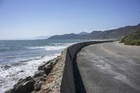 A scenic drive along the Pacific Coast Highway in California, USA. The coastal road winds along the shore, with clear skies overhead and the expansive ocean as a backdrop. The road surface is smooth and lined with guard rails, offering breathtaking views of the beach and waves.
