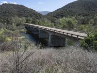 a view from a bridge overlooking trees and a mountain range of hills behind a bridge