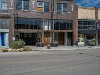 A view of a classic architecture storefront in a small rural town in Utah. The road is lined with shops and the sky is filled with fluffy clouds. A typical day in an American small town.
