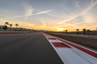 A scenic view of a straight road leading into the distance, made of smooth asphalt. The road curves slightly and is lined with trees on either side. This photo was taken at dawn in the USA, with the sun visible on the horizon. The break of day casts a warm glow on the road, creating a peaceful atmosphere. It could be a race track but it is perfect for a drive or a morning run. The sky is clear with a few fluffy clouds adding depth to the image. Enjoy the sunny weather and feel the warmth of the sunshine on your face.