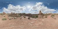 Utah's desert landscape with a river cutting through. Sun shines on the open space, highlighting the rocky surface. Greenery contrasts with sandy areas. A sunny day in the USA.