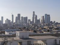 A stunning cityscape of Los Angeles, California, showcases its modern architecture and high-rise buildings. The clear sky enhances the urban design and concrete streets. The view from a rooftop captures the vibrant energy of this iconic city.
