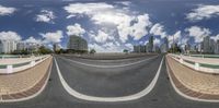 a road and buildings with a cloudy blue sky in the background for a 360 - lens photo