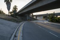 An empty highway under a concrete bridge in Los Angeles at dawn. The clear sky casts a beautiful light on the asphalt road. A glimpse of the vibrant city life with urban infrastructure.