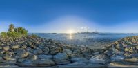 a bunch of rocks on the edge of the water next to rocks on the shoreline and a tree near the water and the city