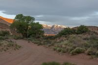 Open desert landscape in Utah, with red rock formations and mountains in the distance. A dirt road winds through the natural environment, surrounded by vegetation. Explore the off-road tracks in North Wash and Canyonlands.