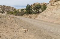 Off-road track cutting through the stunning landscape of San Rafael Swell in Utah, USA. The brown and red rock formations provide a striking contrast against the grey and gloomy sky. A dirt road winds through the canyonlands, surrounded by desert vegetation.