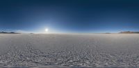 a snow covered plain with a bright sun in the background next to some mountains and mountains