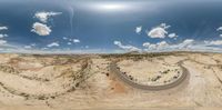 a very big winding road in the desert with mountains and clouds in the sky, shot through fisheye lens