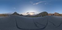 A road in Utah under the clear morning sky with the sun visible, casting hard shadows. Curving through the open landscape, the asphalt contrasts with the natural beauty of the USA's dawn.