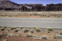 This image captures the stunning landscape of Hite Red Rocks in Canyonlands, Utah. The clear sky and elevated location provide a panoramic view of the mountainous terrain and the vegetation growing along the bedrock. The asphalt road winds through the desert, showcasing the beautiful road surface. This photo perfectly represents the natural beauty of Utah, with its high elevation and unique plant communities. It is a great representation of a typical day in the desert of the USA.