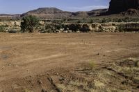 A rugged and picturesque landscape in Utah's Canyonlands. The clear sky contrasts with the red rock formations and the rugged rock walls. A dirt road winds through the canyon, surrounded by grass and vegetation. A perfect day for an adventure in nature.