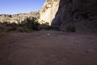 rocks in a desert with trees and bushes below them in the foreground and sky above the cliff