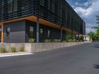 a building with a logo painted on the side near a street that has a sidewalk next to it