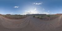 a 360 - view image of dirt road in the middle of desert landscape with sun shining over hill