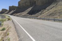 A scenic view of a winding road through Utah's desert landscape. The road surface, lined with Armco barriers, cuts across the red rock mountains of San Rafael Swell. Clear skies and canyonlands offer a picturesque journey.