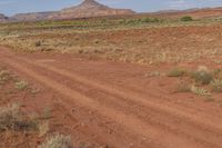Bike parked on a dirt road in the Utah desert. Red rock landscape with sparse vegetation. High mountain landforms and rugged slopes surround the off-road track. A picturesque day in the Canyonlands.