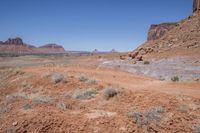 Rugged mountain landscape in Utah, USA. Red rock formations and canyons dominate the terrain. Clear sky and off-road tracks carve through the desert. A picturesque day in the Canyonlands.