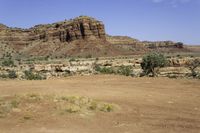 a person riding on top of an unpaved dirt field in front of tall red rocks