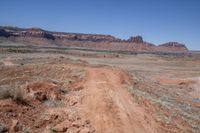 This is an image of a rugged desert landscape in Utah, USA. The red rock formations and mountain landforms dominate the scene, with a clear sky overhead. A dirt road, lined with gravel, winds through the canyonlands, providing a straight path into the distance. The bedrock and brown earth add to the natural beauty of this off-road track. This photo captures the essence of the desert's untouched nature and rugged beauty.