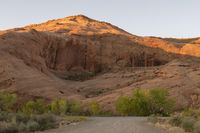 This stock photo captures the stunning beauty of the Utah desert at dawn. The desert landscape is dominated by red rocks and mountains, with a dirt road winding through it. The open space is surrounded by grass and offers a peaceful and serene natural environment. The clear sky above adds to the beauty of the scene, making it a perfect representation of the North Wash area in Utah, USA. The image showcases the unique terrain with its rocky bedrock, sandy soil, and gravel road surface. It's a perfect image to depict the off-road tracks and highlands of Utah's mountainous region.