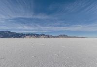 a very large flat desert with footprints in it in front of mountains in the distance